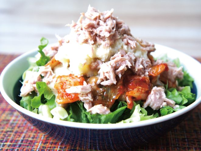 ③キムチ、ポテトサラダ、シーチキンをのせたら完成です。