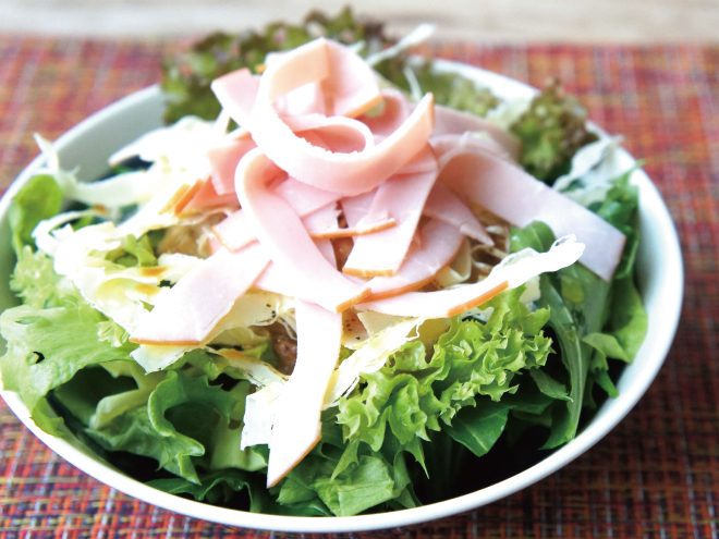 納豆(丹念納豆)、キャベツ、レタス、ハム、削りチーズ、ポン酢、オリーブオイル、粗びき塩コショウ