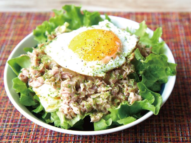 ③目玉焼きを作ったら、サラダの上にのせて、粗びき塩コショウと青のりをかけて完成です。