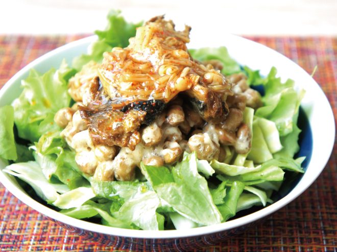 納豆(丹念納豆)、キャベツ、レタス、さんまの蒲焼缶詰、なめ茸、一味唐辛子、オリーブオイル、ポン酢