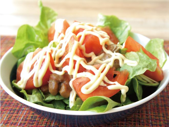 納豆(丹念納豆)、レタス、トマト、マヨネーズ、岩塩、ポン酢