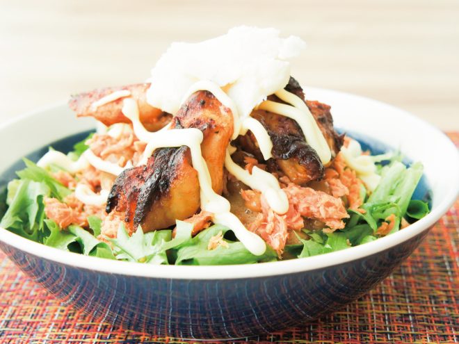 ③シャケフレークとマヨネーズをかけたら、トマトチキンと、ポテトサラダをのせて完成です。
