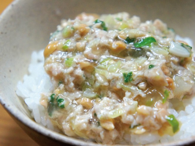 ②ボールにみじん切りにした材料、納豆、合ひき肉と適量の調味料(醤油、酒、ごま油を混ぜ合わせたもの)を入れて良く混ぜ合わせます。