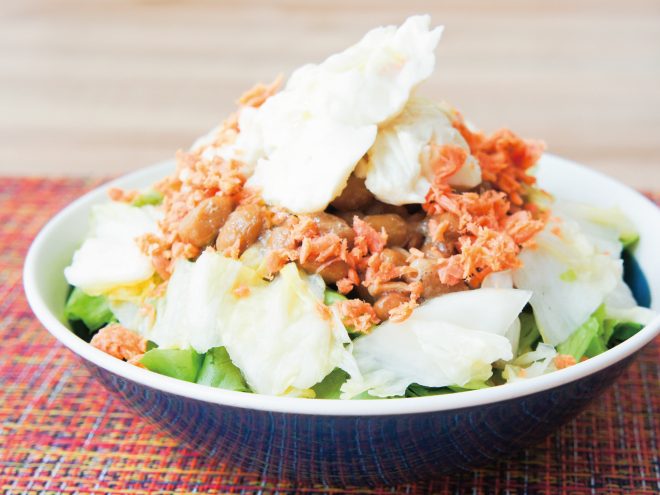 納豆(丹念納豆)、レタス、キャベツ、シャケフレーク、白菜漬け、ポテトサラダ、ポン酢、オリーブオイル