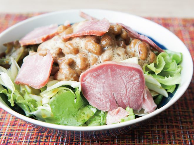 納豆(丹念納豆)、レタス、キャベツ、スモーク牛タン、レモン果汁、ポン酢、オリーブオイル