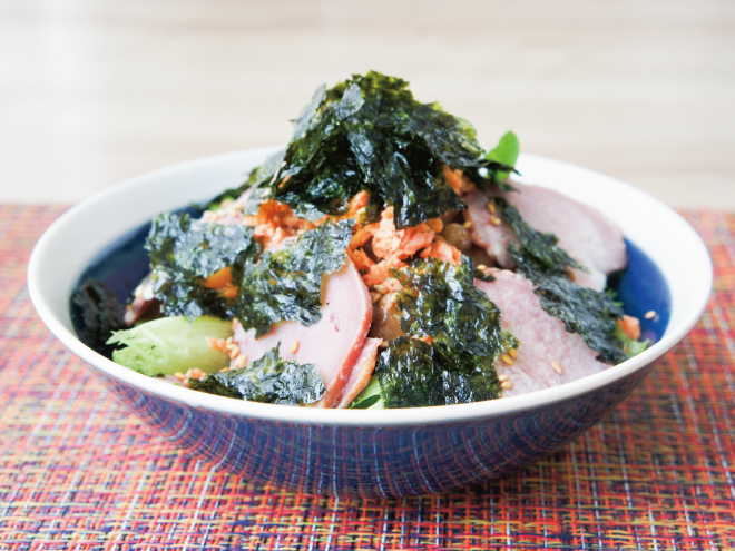 ③スモークタンをのせたら、シャケフレーク、ごま、ちぎった韓国のりをかけて完成です。