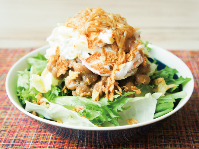 納豆(丹念納豆)、レタス、キャベツ、マカロニサラダ、なめ茸、フライドオニオン、ポン酢、オリーブオイル