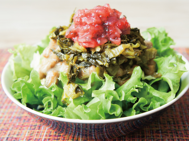 納豆(丹念納豆)、レタス、キャベツ、梅くらげ、高菜、ポン酢