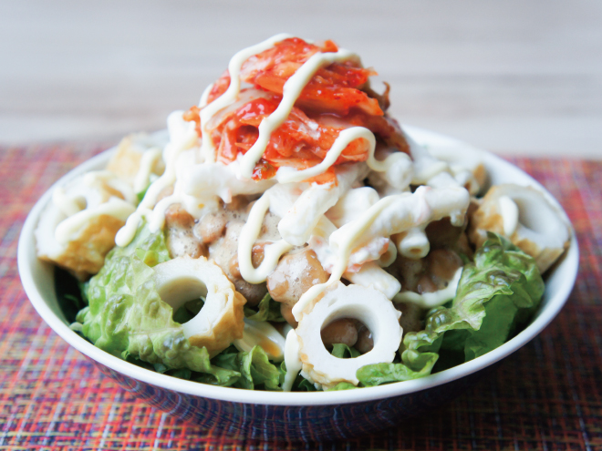 納豆(丹念納豆)、レタス、キャベツ、ちくわ、マカロニサラダ、キムチ、マヨネーズ、ポン酢