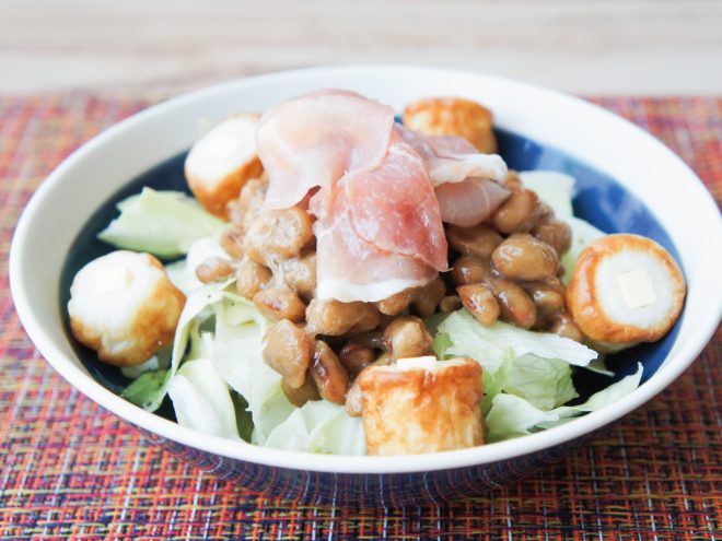 納豆(丹念納豆)、レタス、キャベツ、ちーちく、生ハム、オリーブオイル、粗びき塩コショウ