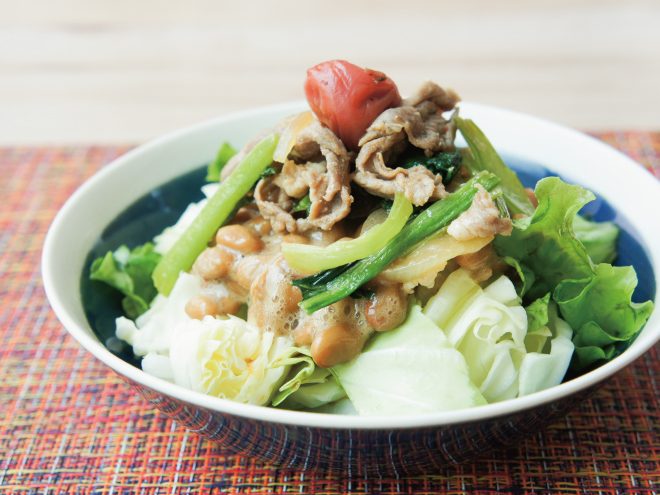 納豆(丹念納豆)、豚薄切り肉、小松菜、玉ねぎ、醤油、酒、みりん、にんにく、レタス、キャベツ、梅、ポン酢