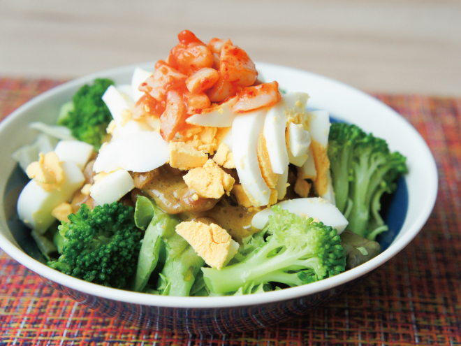 納豆(丹念納豆)、レタス、キャベツ、ブロッコリー、卵、つぶ貝チャンジャ、ポン酢、オリーブオイル