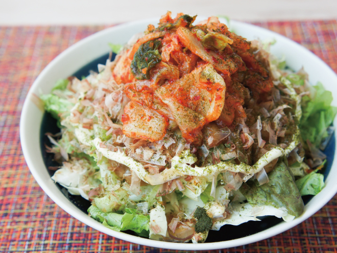 青のりとかつおマヨ納豆キムチサラダ 材料納豆(丹念納豆)、レタス、キャベツ、かつおぶし、キムチ、マヨネーズ、青のり、ポン酢青のりとかつおマヨ納豆キムチサラダの作り方①レタスとキャベツは、食べやすい大きさに切ったら、器に盛りつけます。②ポン酢、よく混ぜた納豆をかけます。③かつおぶしをかけたらキムチをのせ、マヨネーズと青のりをかけて完成です。