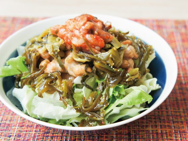 たこキムチと高菜めかぶ納豆サラダ 材料納豆(丹念納豆)、レタス、キャベツ、高菜、子持ちめかぶ、たこキムチ、ポン酢たこキムチと高菜めかぶ納豆サラダの作り方①レタスとキャベツは、食べやすい大きさに切ったら、器に盛りつけます。②ポン酢、よく混ぜた納豆をかけます。③高菜、子持ちめかぶ、たこキムチをかけて完成です。