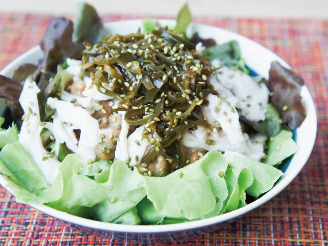 納豆(丹念納豆)、レタス、キャベツ、蒸し鶏、子持ちメカブ、あおさ胡麻、ポン酢