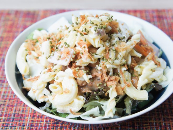 ⑦マカロニサラダ、フライドオニオン、あおさ胡麻をかけたら完成です。