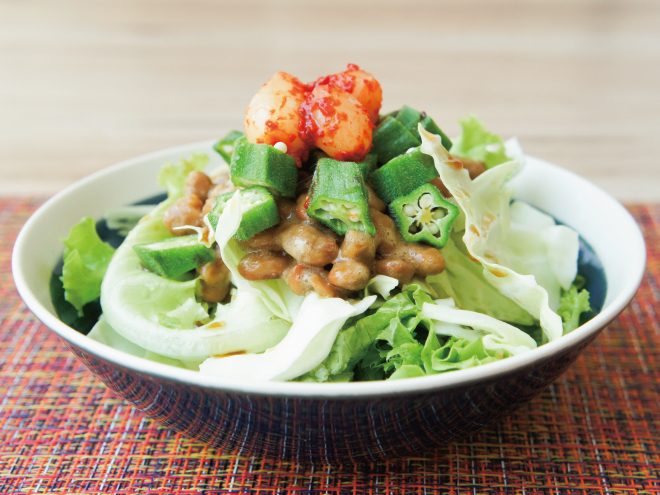 キムチらっきょうとおくら納豆サラダ 材料納豆(丹念納豆)、レタス、キャベツ、おくら、キムチらっきょう、ポン酢キムチらっきょうとおくら納豆サラダの作り方①おくらを茹でたら、輪切りにしておきます。②レタスとキャベツは、食べやすい大きさに切ったら、器に盛りつけます。③ポン酢、よく混ぜた納豆をかけます。④おくらをかけたら、キムチらっきょうをのせて完成です。