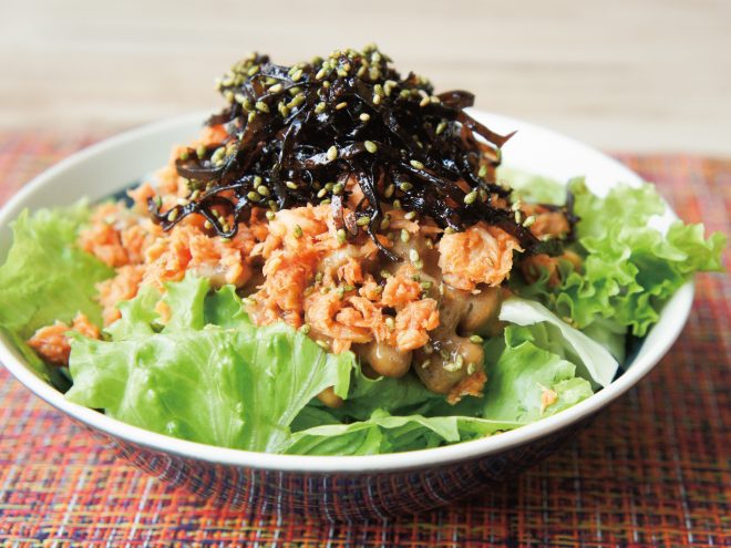 シャケ昆布ごま納豆梅サラダ 材料納豆(丹念納豆)、レタス、キャベツ、シャケフレーク、かつお梅ペースト、しそ昆布の佃煮、あおさ胡麻、ポン酢シャケ昆布ごま納豆梅サラダの作り方①レタスとキャベツは、食べやすい大きさに切ったら、器に盛りつけます。②ポン酢、よく混ぜた納豆をかけます。③シャケフレーク、かつお梅ペースト、しそ昆布の佃煮、あおさ胡麻をかけて完成です。