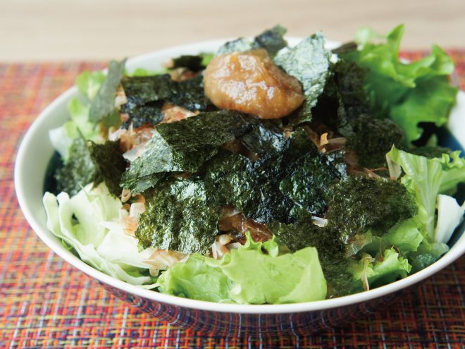 納豆(丹念納豆)、レタス、キャベツ、かつおぶし、焼きのり、かつお梅ペースト、しょうゆ、ポン酢