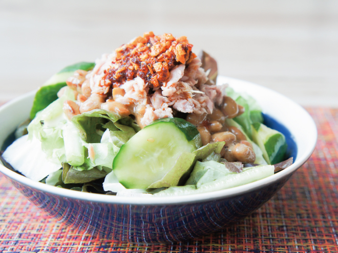 きゅうりと納豆シーチキンラー油サラダ 材料納豆(丹念納豆)、レタス、キャベツ、きゅうり、塩、薄口醤油、酢、砂糖、塩昆布、シーチキン、食べるラー油、ポン酢きゅうりと納豆シーチキンラー油サラダの作り方①きゅうりは皮を剥いて、斜め薄切りにします。②ボールに①を入れて、塩を少々振りしんなりさせたら、薄口醤油、酢、砂糖、塩昆布を加えてよく和えます。③レタスとキャベツは、食べやすい大きさに切ったら、器に盛りつけます。④ポン酢、よく混ぜた納豆をかけます。⑤きゅうりの和え物、シーチキン、食べるラー油をかけたら完成です。