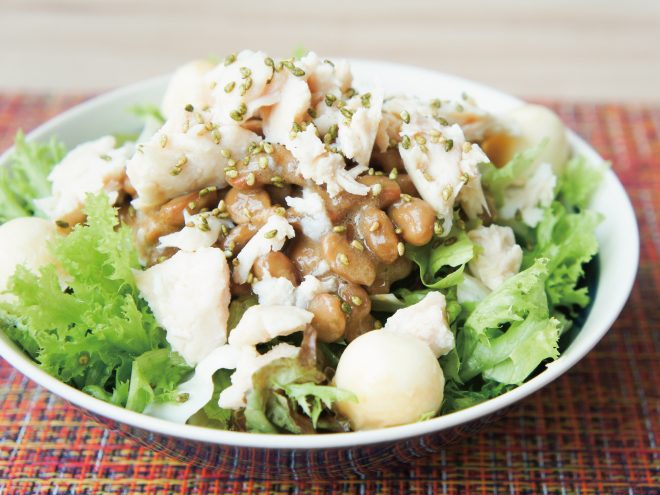 モッツァレラチーズとあおさ納豆蒸し鶏サラダ 材料納豆(丹念納豆)、レタス、キャベツ、モッツァレラチーズ、あおさ胡麻、蒸し鶏、ポン酢モッツァレラチーズとあおさ納豆蒸し鶏サラダの作り方①レタスとキャベツは、食べやすい大きさに切ったら、器に盛りつけます。②ポン酢、よく混ぜた納豆をかけます。③蒸し鶏、モッツァレラチーズをのせたら、あおさ胡麻をかけて完成です。