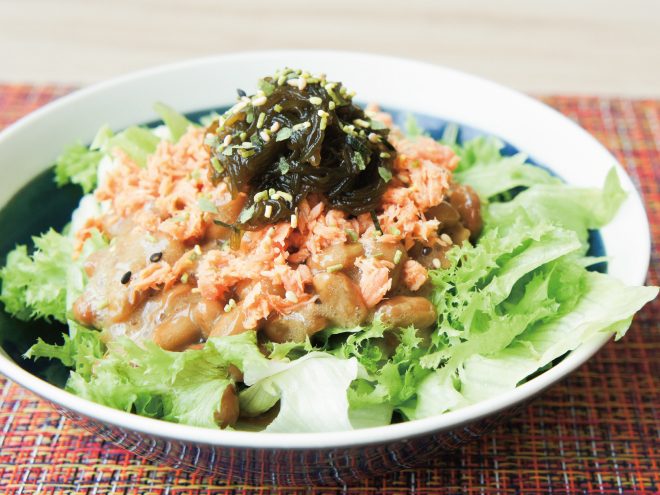 シャケ納豆ゆずもずくサラダ 材料納豆(丹念納豆)、レタス、キャベツ、シャケフレーク、もずく、ゆず胡椒ふりかけ、ポン酢シャケ納豆ゆずもずくサラダの作り方①レタスとキャベツは、食べやすい大きさに切ったら、器に盛りつけます。②ポン酢、よく混ぜた納豆をかけます。③シャケフレーク、もずくをのせたら、ゆず胡椒ふりかけをかけて完成です。