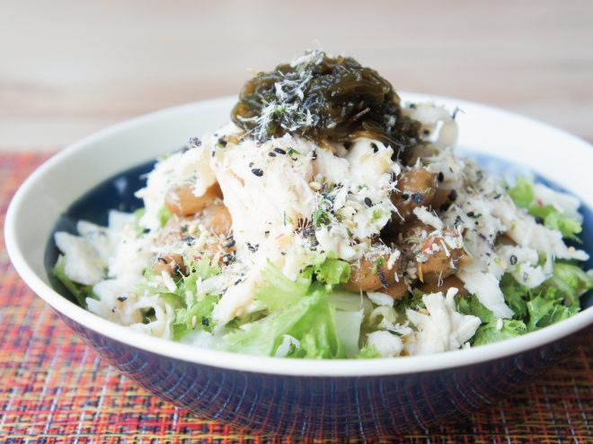 納豆(丹念納豆)、レタス、キャベツ、蒸し鶏、もずく、たらふりかけ、ポン酢