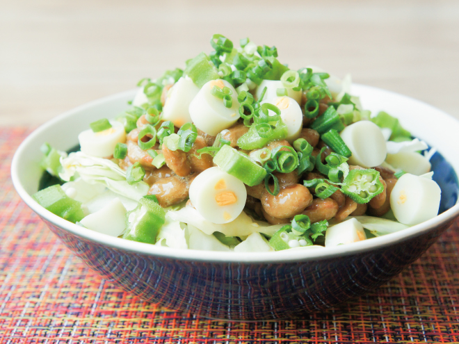 枝豆チーチクねぎ納豆おくらサラダ 材料納豆(丹念納豆)、レタス、キャベツ、おくら、枝豆チーチク、ねぎ、ポン酢枝豆チーチクねぎ納豆おくらサラダの作り方①オクラをゆでたら、輪切りにしておきます。②レタスとキャベツは、食べやすい大きさに切ったら、器に盛りつけます。③ポン酢、よく混ぜた納豆、オクラをかけます。④枝豆チーチクを輪切りにしてかけたら、ねぎをちらして完成です。
