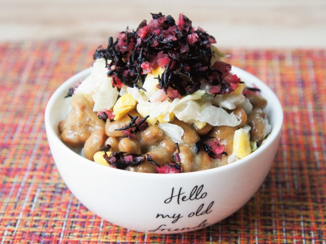 納豆(丹念納豆)、コールスロー、梅ひじき、ご飯