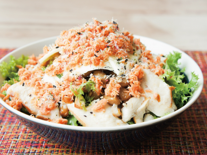 鮭納豆チーズスモークチキンサラダ 材料納豆(丹念納豆)、レタス、キャベツ、スライスチーズ、鮭フレーク、スモークチキン、たらふりかけ、ポン酢鮭納豆チーズスモークチキンサラダの作り方①レタスとキャベツは、食べやすい大きさに切ったら、器に盛りつけます。②ポン酢、よく混ぜた納豆をかけます。③スライスチーズをのせたら、スモークチキンをかけます。④鮭フレークと、たらふりかけをかけたら完成です。