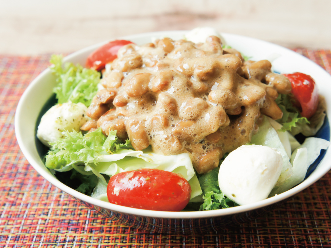 カプレーゼ納豆サラダ 材料納豆(丹念納豆)、レタス、キャベツ、フルーツトマト、クリームチーズ、バジルソース、ポン酢カプレーゼ納豆サラダの作り方①レタスとキャベツは、食べやすい大きさに切ったら、器に盛りつけます。②ポン酢、よく混ぜた納豆をかけます。③フルーツトマトを半分に切ったものとクリームチーズに、バジルソースをかけたものをかけて完成です。
