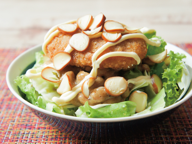 マヨコロッケ納豆スモークチーズサラダ 材料納豆(丹念納豆)、レタス、キャベツ、コロッケ、スモークチーズ、マヨネーズ、ポン酢マヨコロッケ納豆スモークチーズサラダの作り方①レタスとキャベツは、食べやすい大きさに切ったら、器に盛りつけます。②ポン酢、よく混ぜた納豆をかけます。③コロッケをのせたら、マヨネーズ、スモークチーズをかけて完成です。