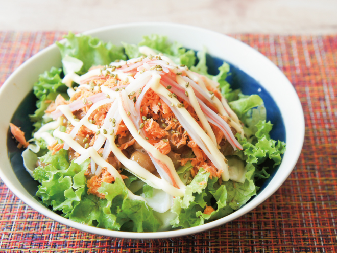 納豆(丹念納豆)、レタス、キャベツ、シャケフレーク、かにかま、あおさ胡麻、マヨネーズ、ぽん酢