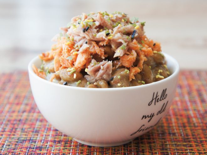 ②シャケフレーク、シーチキン、ゆず胡椒ふりかけをかけて完成です。