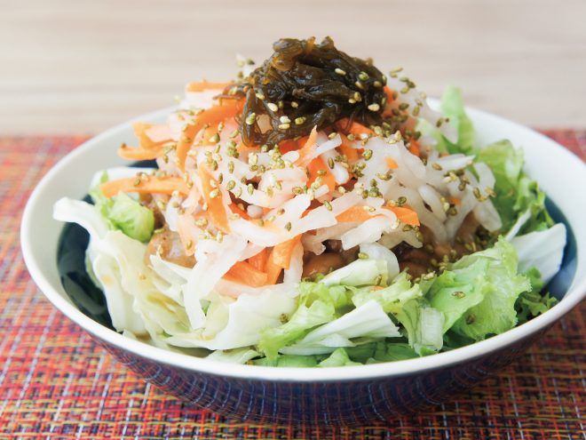 納豆(丹念納豆)、レタス、キャベツ、なます、もずく、あおさ胡麻、ポン酢