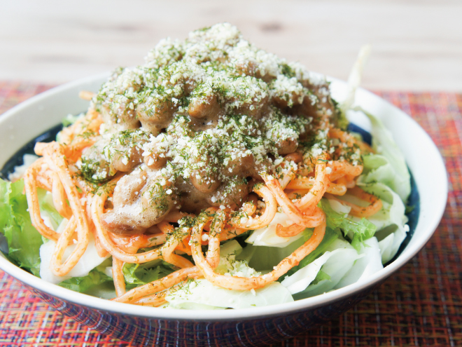納豆(丹念納豆)、パスタ、ウインナー、ピーマン、玉ねぎ、ケチャップ、コンソメ、レタス、キャベツ、粉チーズ、青のり、オリーブオイル、粗挽き塩こしょう