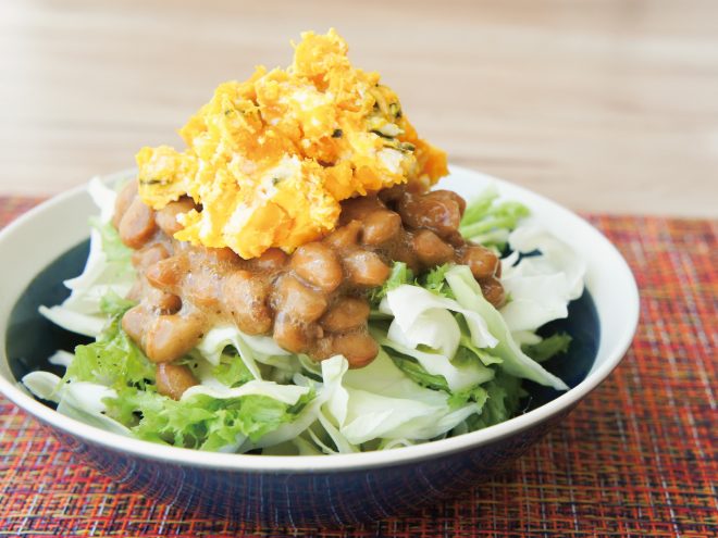 納豆かぼちゃサラダ 材料納豆(丹念納豆)、レタス、キャベツ、かぼちゃサラダ、オリーブオイル、粗挽き塩こしょう納豆かぼちゃサラダの作り方①レタスとキャベツは、食べやすい大きさに切ったら、器に盛りつけます。②オリーブオイル、粗挽き塩こしょう、よく混ぜた納豆をかけます。③かぼちゃサラダをのせたら完成です。
