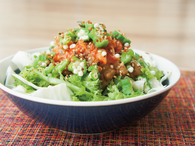 キムチ納豆おくら鰹サラダ 材料納豆(丹念納豆)、レタス、キャベツ、キムチ、おくら、鰹ふりかけ、オリーブオイルキムチ納豆おくら鰹サラダの作り方①レタスとキャベツは、食べやすい大きさに切ったら、器に盛りつけます。②オリーブオイル、よく混ぜた納豆をかけます。③キムチをのせたら、湯通しし輪切りにしたオクラをのせます。④最後に、鰹ふりかけをかけて完成です。