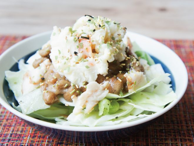 ゆず胡椒ポテサラ蒸し鶏納豆サラダ 材料納豆(丹念納豆)、レタス、キャベツ、蒸し鶏、ポテサラ、ゆず胡椒ふりかけ、オリーブオイル、粗挽き塩こしょうゆず胡椒ポテサラ蒸し鶏納豆サラダの作り方①レタスとキャベツは、食べやすい大きさに切ったら、器に盛りつけます。②オリーブオイル、粗挽き塩こしょう、よく混ぜた納豆をかけます。③蒸し鶏、ポテサラをのせたら、ゆず胡椒ふりかけをかけて完成です。