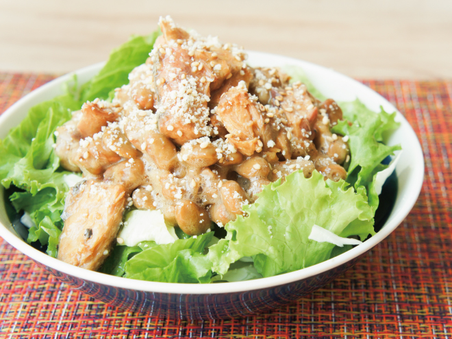 味噌サバ納豆チーズ胡麻サラダ 材料納豆(丹念納豆)、レタス、キャベツ、さばの味噌煮缶、粉チーズ、いりごま、オリーブオイル味噌サバ納豆チーズ胡麻サラダの作り方①レタスとキャベツは、食べやすい大きさに切ったら、器に盛りつけます。②オリーブオイル、よく混ぜた納豆をかけます。③サバの味噌煮をのせたら、粉チーズ、いりごまをかけて完成です。