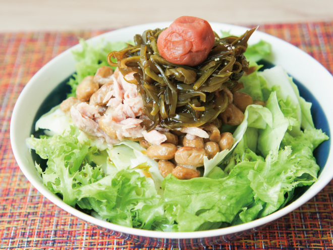 子持ちメカブ納豆シーチキン梅サラダ 材料納豆(丹念納豆)、レタス、キャベツ、シーチキン、子持ちメカブ、梅、ポン酢、オリーブオイル、粗挽き塩こしょう子持ちメカブ納豆シーチキン梅サラダの作り方①レタスとキャベツは、食べやすい大きさに切ったら、器に盛りつけます。②ポン酢、オリーブオイル、粗挽き塩こしょう、よく混ぜた納豆をかけます。③シーチキン、子持ちメカブ、梅をかけたら完成です。