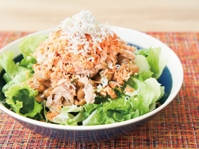 ちりめん鮭シーチキン納豆ゆずサラダ 材料納豆(丹念納豆)、レタス、キャベツ、シーチキン、シャケフレーク、ちりめんじゃこ、ゆず胡椒ふりかけ、オリーブオイル、粗挽き塩こしょうちりめん鮭シーチキン納豆ゆずサラダの作り方①レタスとキャベツは、食べやすい大きさに切ったら、器に盛りつけます。②オリーブオイル、粗挽き塩こしょう、よく混ぜた納豆をかけます。③シーチキン、シャケフレーク、ちりめんじゃこをかけます。④ゆず胡椒ふりかけをかけたら完成です。