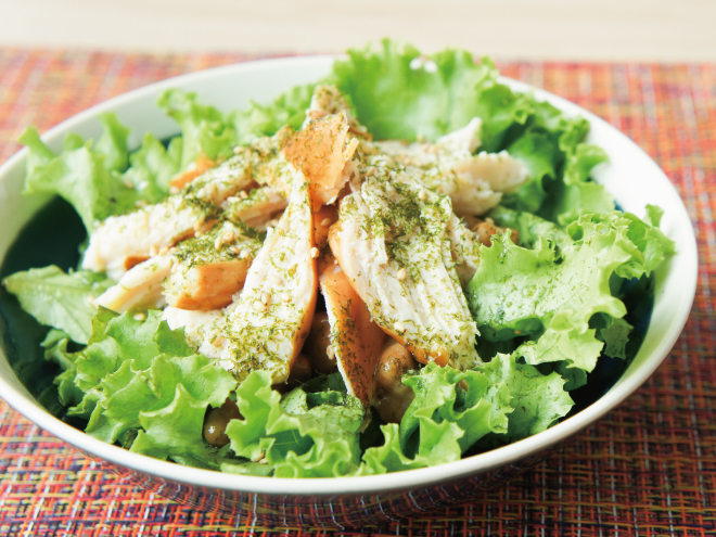 スモーク蒸し鶏とオリーブ青のり納豆サラダ 材料納豆(丹念納豆)、レタス、スモーク蒸し鶏、青のり、いりごま、オリーブオイルスモーク蒸し鶏とオリーブ青のり納豆サラダの作り方①レタスを食べやすい大きさに切ったら、器に盛りつけます。②よく混ぜた納豆と、割いたスモーク蒸し鶏をかけます。③オリーブオイル、青のり、いりごまをかけたら完成です。