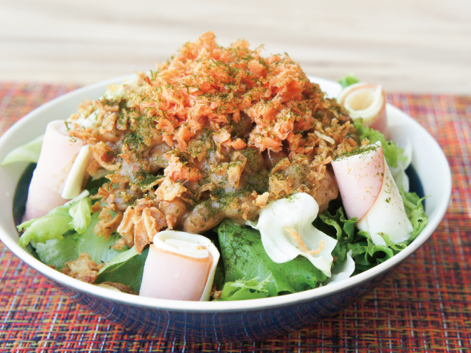 ④ハムチーズを盛りつけたら、フライドオニオン、シャケフレーク、青のりをかけて完成です。