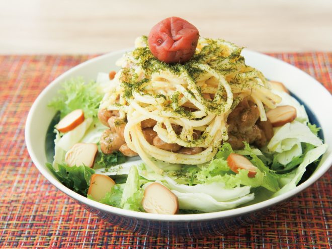 梅納豆青のりスパサラチーズサラダ 材料納豆(丹念納豆)、レタス、キャベツ、スパサラ、スモークチーズ、青のり、梅、オリーブオイル、粗挽き塩こしょう梅納豆青のりスパサラチーズサラダの作り方①レタスとキャベツは、食べやすい大きさに切ったら、器に盛りつけます。②オリーブオイル、粗挽き塩こしょう、よく混ぜた納豆をかけます。③スパサラをのせたら、切ったスモークチーズを散らします。④青のりをかけて、梅をのせたら完成です。