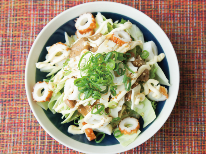 納豆(丹念納豆)、レタス、キャベツ、スライスチーズ、ちくわ。マヨネーズ、ねぎ、いりごま、オリーブオイル、粗挽き塩こしょう
