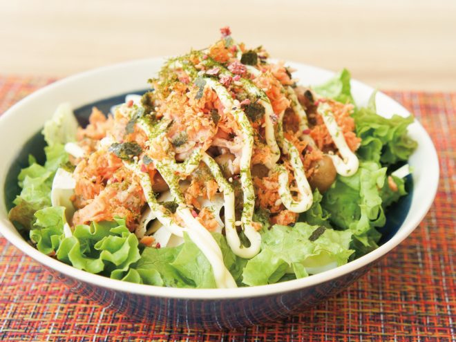 ③シーチキン、シャケフレーク、マヨネーズ、青のり、梅ふりかけをかけて完成です。