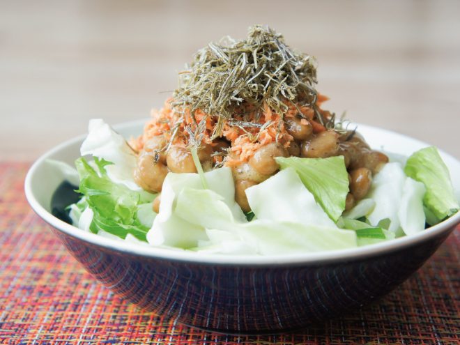 納豆(丹念納豆)、レタス、キャベツ、シャケフレーク、ふりかけ昆布、オリーブオイル、粗挽き塩こしょう
