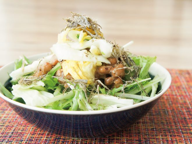 ゆず白菜漬け納豆昆布サラダ 材料納豆(丹念納豆)、レタス、キャベツ、水菜、ゆず白菜漬け、ふりかけ昆布、オリーブオイル、粗挽き塩こしょうゆず白菜漬け納豆昆布サラダの作り方①レタスとキャベツ、水菜は、食べやすい大きさに切ったら、器に盛りつけます。②オリーブオイル、粗挽き塩こしょう、よく混ぜた納豆をかけます。③ゆず白菜漬け、ふりかけ昆布をかけたら完成です。