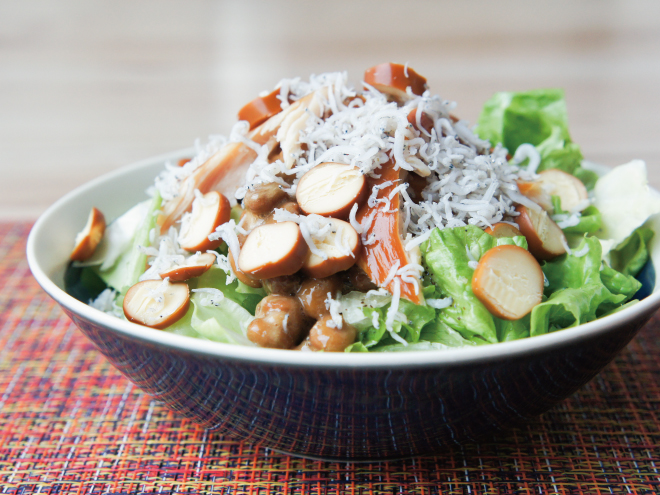 納豆(丹念納豆)、レタス、キャベツ、スモークチキン、スモークチーズ、ちりめんじゃこ、オリーブオイル、粗挽き塩こしょう